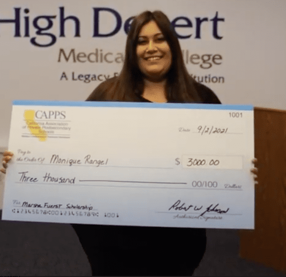 Congratulations to CAPPS Marsha Fuerst scholarship award winner, HDMC Bakersfield medical assisting student Ms. Monique Rangel! High Desert Medical College, in Bakersfield, California, is proud to announce medical assisting student Monique Rangel has been selected as the 2021 recipient of the Marsha Fuerst Memorial Scholarship, given by the California Association of Private Postsecondary Schools (CAPPS). HDMC specializes in training students for in-demand healthcare careers, and we are proud of Monique, as well as all of our hardworking students, for pursuing their healthcare career dreams.