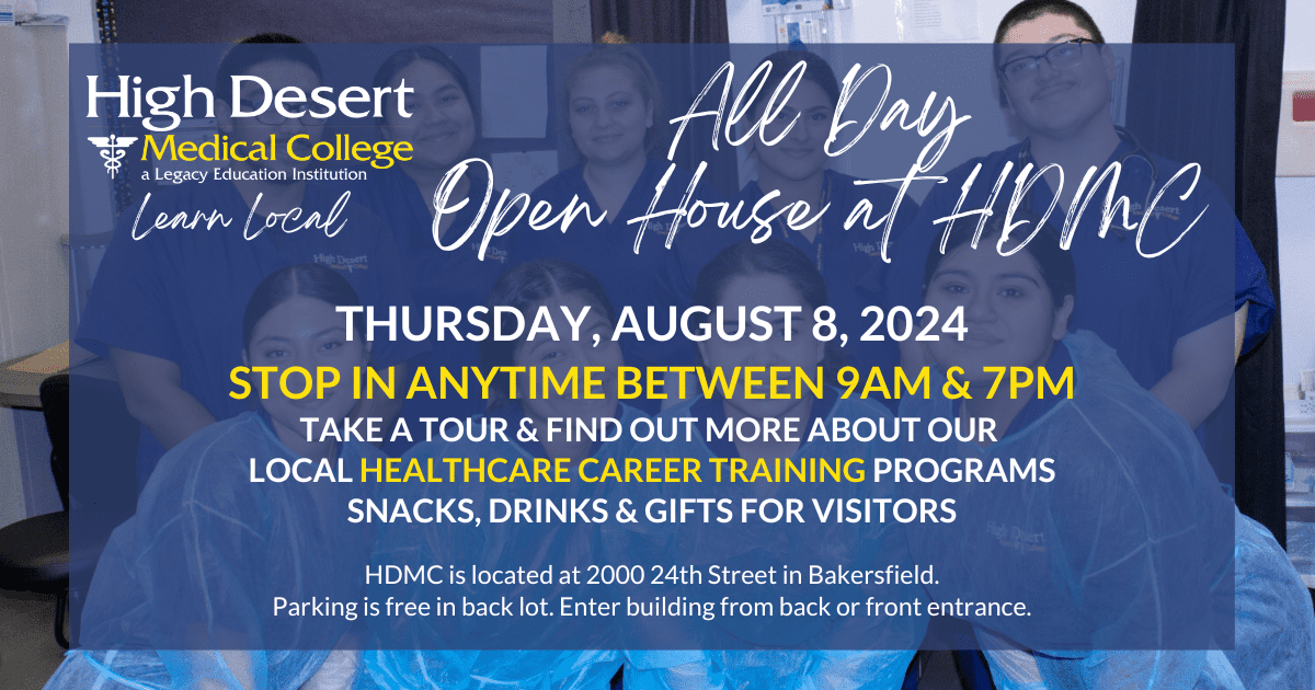 Join us for an All Day Open House at High Desert Medical College in Bakersfield on Thursday, August 8, 2024. Stop by anytime from 9am to 7pm.