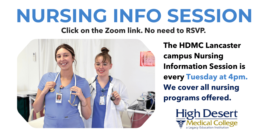 High Desert Medical College in Lancaster invites you to attend one of our Nursing Information Sessions on any Tuesday at 4pm by Zoom. Our admissions team will review all the nursing programs offered at HDMC, including Vocational Nursing, Vocational Nursing AAS and Associate Degree Nursing (ADN/RN).