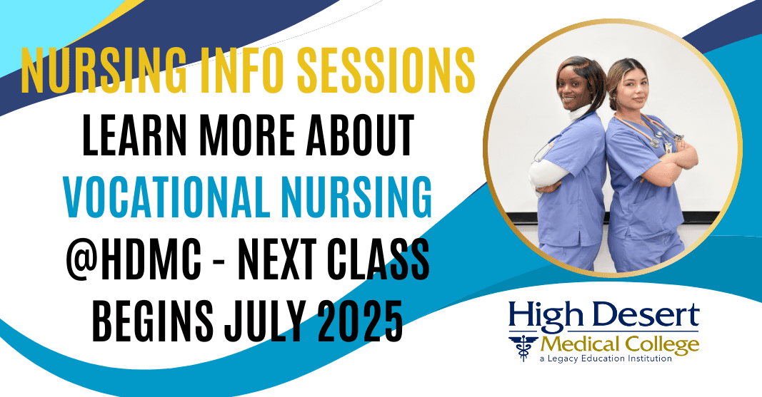 High Desert Medical College in Temecula invites you to a Nursing Information Session by Zoom on Thursday, July 17 at 12pm and 6pm. Choose a time that works best for you. Our admissions team will review the Vocational Nursing program from testing to classroom, labs and curriculum, as well as answer any questions you have.