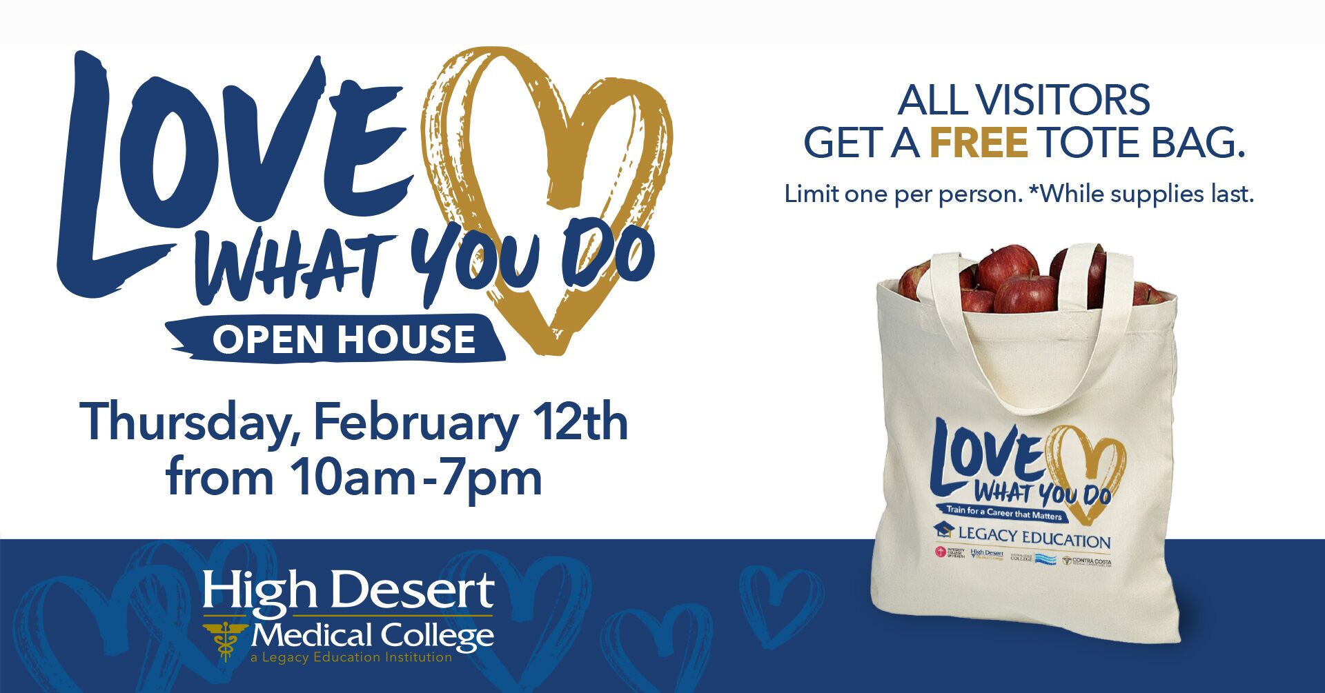 Join us on Thursday, February 12, from 10:00 AM–7:00 PM at all High Desert Medical College campuses in Bakersfield, Lancaster, and Temecula.