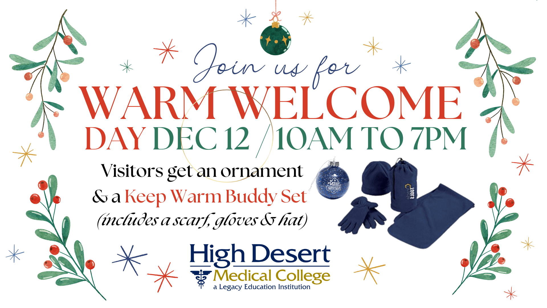 Join us for an All Day Open House at all High Desert Medical College campuses in Bakersfield, Lancaster and Temecula on Thursday, December 12, 2024. Stop by anytime from 10am to 7pm.