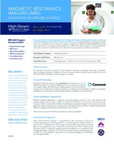 If you are detail-oriented, appreciate technology, and enjoy working with people, a career as a MRI Technologist may be the perfect career for you. The Magnetic Resonance Imaging (MRI) Associate of Applied Science Degree Program at High Desert Medical College (HDMC) is a great way to get trained. Our program prepares you for an MRI career with a program involving classroom theory, lab procedures, externship and online learning for general education requirements.