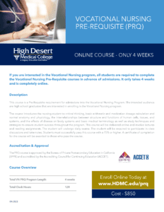 Are you interested in enrolling in our Vocational Nursing program? All LVN students are required to complete the Vocational Nursing Pre-Requisite courses in advance of admissions. The VN PRQ is 100% online, and can be completed in as few as 4 weeks!